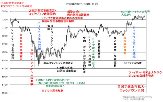 2020年のNZドル円相場は、新型コロナウイルスの感染拡大やNZ準備銀行の歴史的な低水準となる金融緩和にも、リスクオンの堅調な上昇で終了しました。
