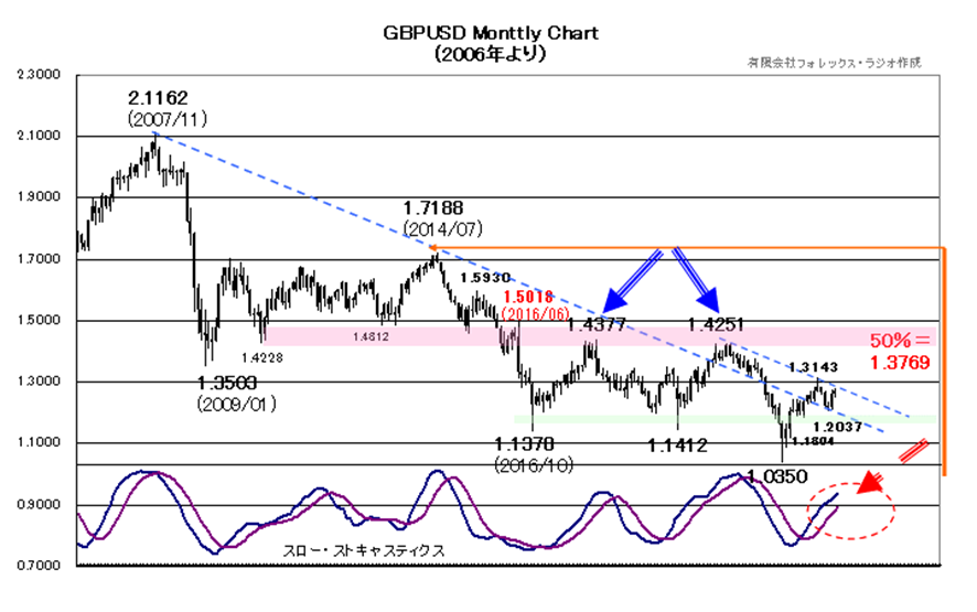 テクニカル面からまず、英ポンド円を構成する英ポンドドル相場の月足をチェックしておきましょう。