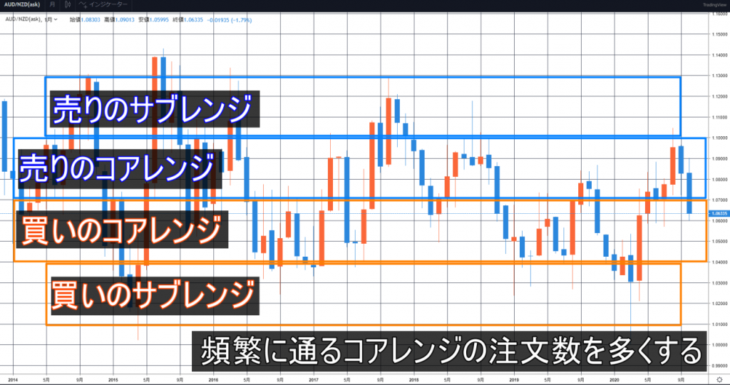 よく通る中央付近に注文を集めるのはコアレンジャーと同様ですが、買いと売りを重ねるのではなく、4つのレンジに分けることで、買いレンジと売りレンジが狭くなり、含み損が少なくて済みます。