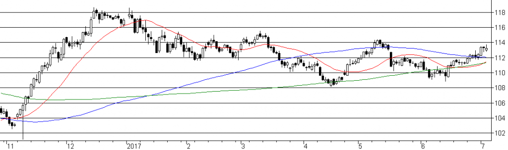 日足は6/14に付けた108.83を起点として下値を切り上げる流れを維持しており、短期トレンドはドル強気の流れにあります。また、収束している21日、120日、200日移動平均線を7/3の陽線がしっかりと上抜けており、新たな上昇トレンド入りした可能性が点灯中です。この移動平均線はそれぞれ、111.40、112.04、111.29に位置しています。