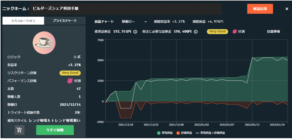 また、他のユーザーが作成した自動売買ロジックの設定値を閲覧することができます。ビルダーズシェアは豊富な知識と経験が集約されています。好成績となるヒントを設定値から探すこともお楽しみいただけるかと思います。