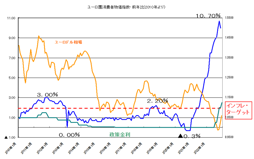 まずユーロ圏消費者物価指数ですが、10.70%まで上昇していますが、一旦上げ渋りも見えています。今後もウクライナ情勢次第でしょうが、ECBが3.50%まで政策金利を引き上げても、インフレを鎮静化できるかは不透明です。