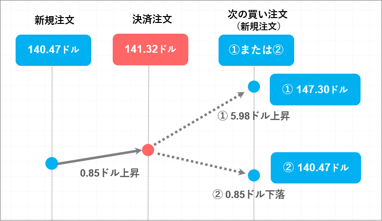 ※決済価格は、取引開始時に相場が大きく上昇して始まった場合には、指定の価格以上で決済する場合があります。その場合、次の買い注文の価格は決済価格を元に算出されるため、上記に記載した価格にならない場合があります。