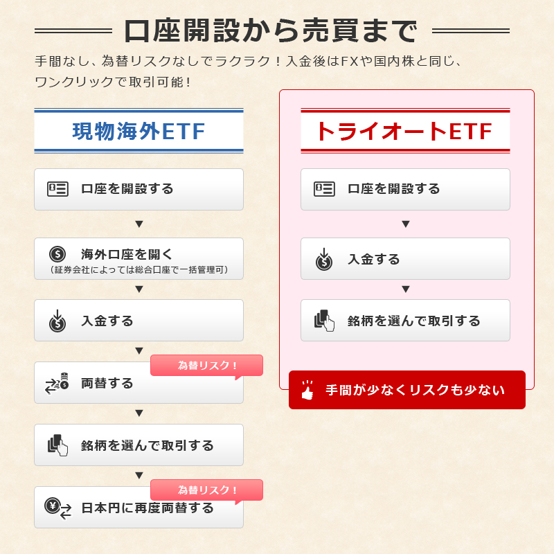いかがですか?手間と発生するリスクに焦点を当てると、手軽さではトライオートETFは圧勝です。