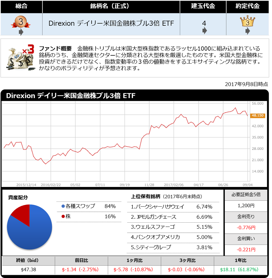 総合3位は「Direxion デイリー米国金融株ブル3倍 ETF 」、通称、金融株トリプル。FRBによる年内追加利上げ期待の後退やトランプ氏の不安定な政権運営等を背景に長期金利の低下に伴い金融株も下げ基調となりましたが、自動売買では【リターン重視】、【バランス重視】で上位にランクインする等依然人気が高く引き続き総合3位となりました。ボラティリティの大きい銘柄なので、値下がり局面で資金ショートしないよう口座の資金管理には十分ご注意ください。