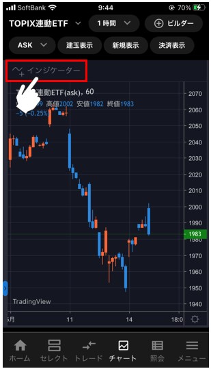 ①「トレード」画面にて「ETF」を選択し、銘柄をタップします。