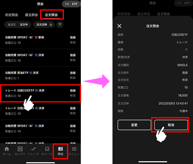 注文変更や取消は注文照会から行います。(注文変更・取消参照)