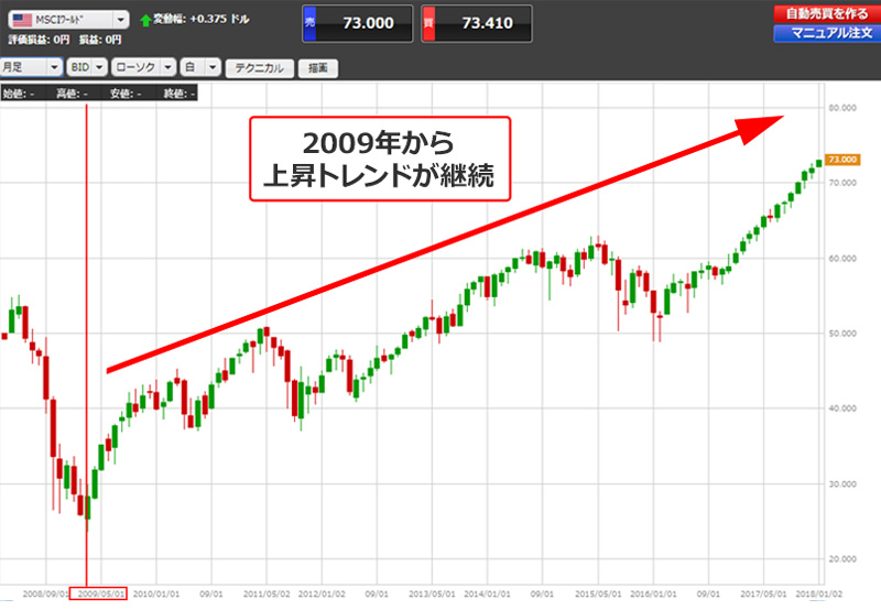 冒頭に「昨年『も』世界的な株高」といいましたが、世界の株式市場においては2009年から上昇トレンドが続いています。