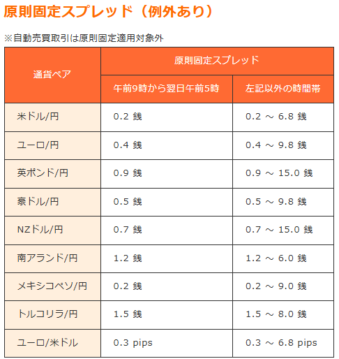 ・午前9時から翌日午前5時の原則固定スプレッド(例外あり)