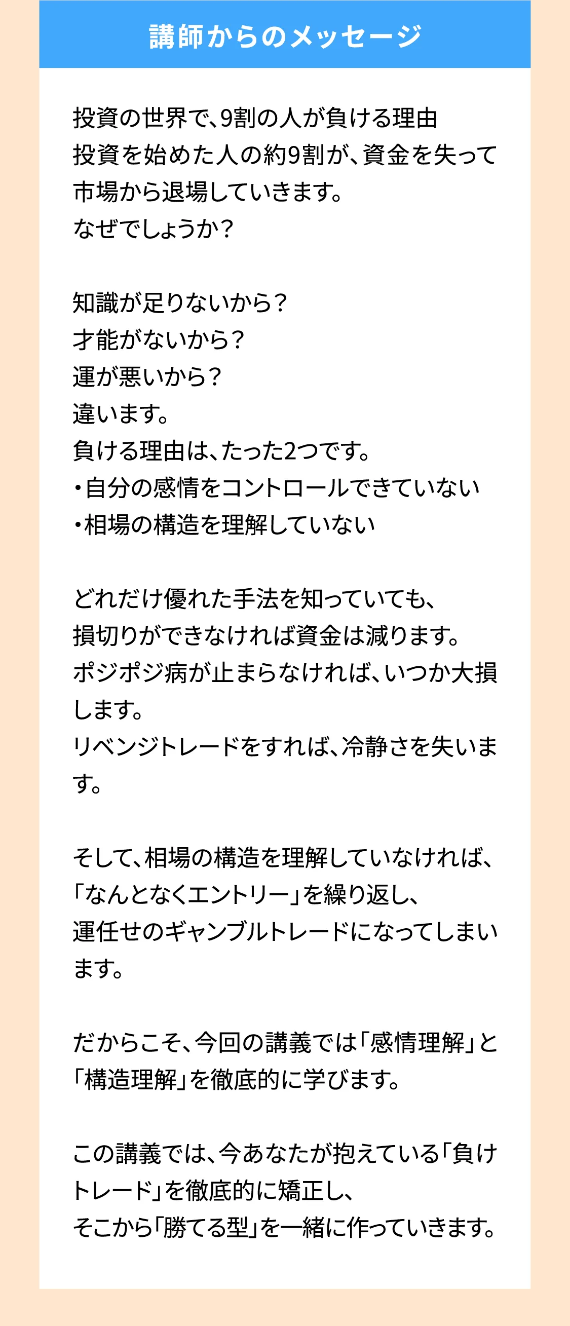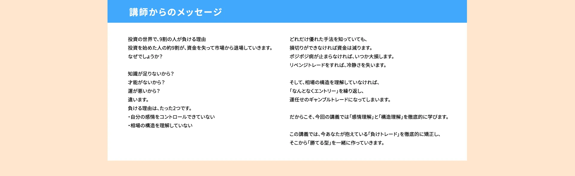 実際に3,000人以上のトレーダーを育て、その実践で役立つ的確かつ濃密な講義内容は非常に高い評価を得ています。