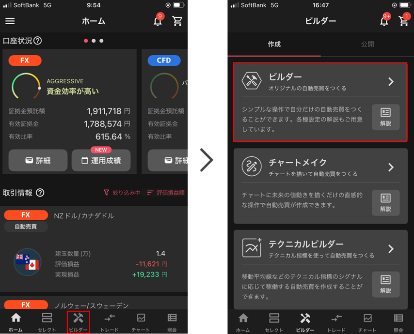 トライオートの「ビルダー」機能を使えば、トレードのアイディアを、実際の自動売買ロジックとしてそのまま形にすることができます。