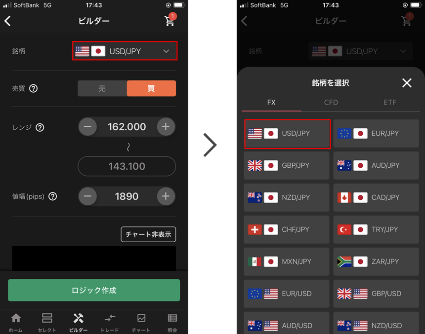 今回はUSD/JPYの自動売買ロジックを作成するため、銘柄をタップし「FX」タブから「USD/JPY」を選択します。