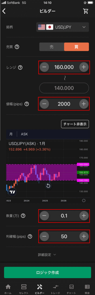 この設定では、レンジの上限が160円、下限が140円となります。