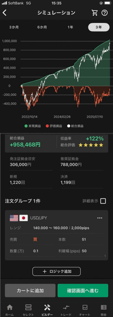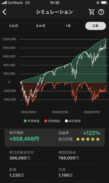 今回の設定では、収益率は +122%、総合損益は +958,468円 という結果となりました。