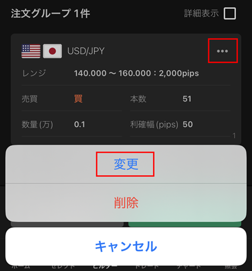 設定を変更するには、注文グループの右上にある「…」 ボタンをタップします。