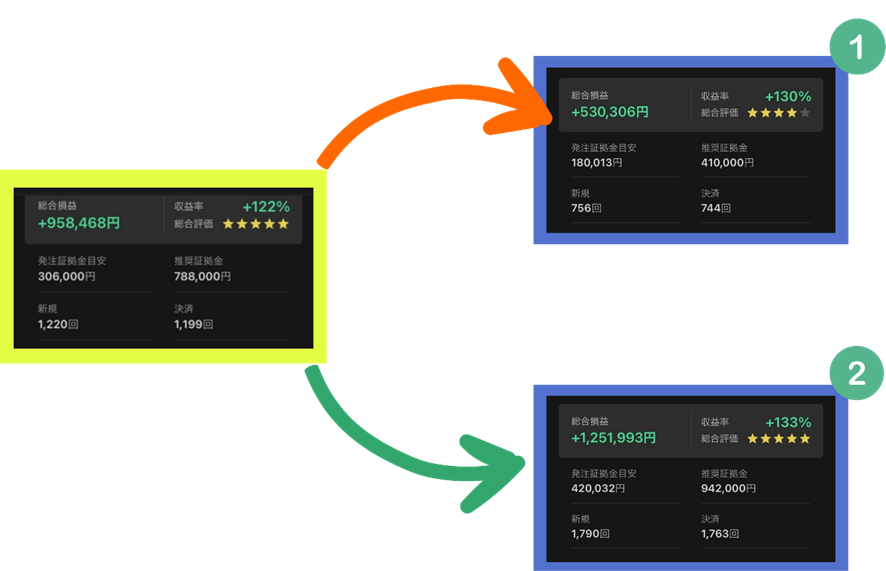 このように、設定を調整することで、シミュレーション結果の収益率や発注証拠金目安といった指標は大きく変わります。