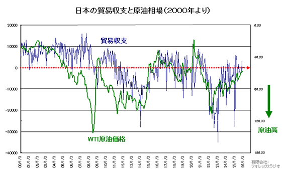 つまり原油価格が2026年中、相場が低迷するなら日本の貿易収支が黒字に転換する可能性が示唆されます。