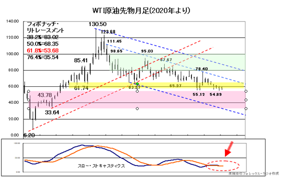 では、原油価格の動向をみてみましょう。2020年からのWTI原油先物の月足チャートです。130.50ドルで高値をつけて、調整を強めています。ただ、現状は54.809-55.12ドル、フィボナッチ・リトレースメントでいうなら61.8%戻しが支えています。そのため更に下落が拡大するとは断言できませんが、上値は今後もレジスタンス圏が押さえて、このネック・ラインを割れると33.64-43.78ゾーンで、フィボナッチ・リトレースメントの76.4%戻しまでの調整リスクとなります。