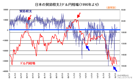 一方で、日本の貿易収支とドル円相場の関連性を見てみましょう。