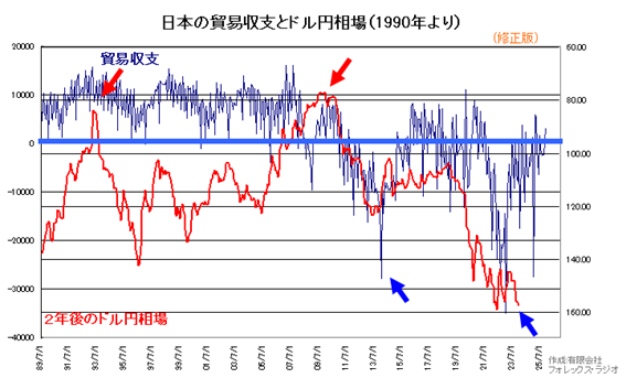 以下は1990年からの日本の貿易収支とドル円相場(逆目盛り)の関連をみたチャートです。総じて連動性が見えるも、一定の時間的誤差が発生しています。