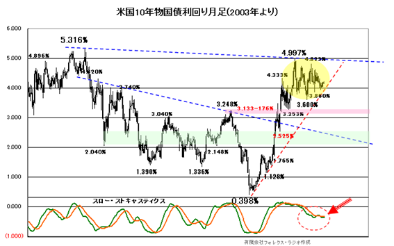 今年もこういったリスクが最大の注意ですが、参考に下記に米10年物国債利回りの、月足チャートを掲載しておきます。テクニカル面からは、若干揉み合い気味ですが、下値はサポートが支えています。こういった状況が続くなら、下段のスロー・ストキャスティクスが既に反転の兆しを示しており、金利が再度5%方向への「悪い金利」上昇リスクとなることは考慮しておきましょう。