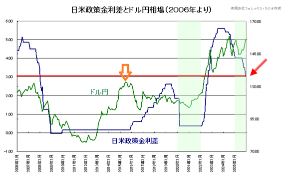 通常ドル円相場は、日米金利差の影響を大きく受けますが、日米金利差の現在の3%水準は要の位置となります。今年FOMCが0.25%の利下げを1回、日銀の利上げが1回程度に留まっても日米金利は2.50%に拡大します。その場合、過去の事例からは、以下のチャートが示すように、ドル円相場が130円程度までの調整することもありそうです。確かに日米金利差だけが相場の決定要因ではありませんが、もし、FOMCと日銀両行が2回の利下げや利上げが実施した場合、2%程度まで金利が広がる可能性も残っています。その場合のドル円相場の調整リスクが残ることは考えておいた方が良いでしょう。