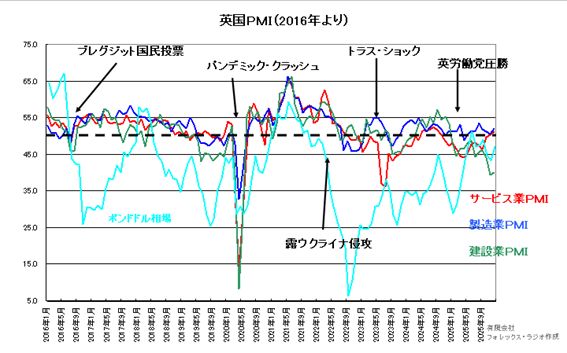 直近では、建設業で落ち込みが見えています。労働党政府の予算や政策の不確実性、高金利による投資抑制から、新規受注不足が影響しているようです。また。、建設コスト・雇用環境の悪化といった複合的な要因が絡み合っているためです。ただ、一方で製造業やサービス業では、景気の分水嶺となる「50」を挟んで上下の動きに留まっています。2026年は、恐らくPMIで「45」から「55」での間で揉み合いが続きそうです。