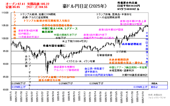 一方日本では、参院議員選挙で、自公民が過半数割れとなり、石破首相が辞意を表明、自民党総裁選で高市氏が勝利、公明党が連立から離脱を表明するも、想定外に日本維新の会が新規に連立を組むことになり、高市総理が実現。高市氏の政策が財政拡張や低金利政策を目指していることから日本株高、円売りの「高市トレード」が強まりました。日経平均株価が年末に向けて5万2千円台まで上昇、日本の長期金利の上昇にも豪ドル円相場は、2024年7月の高値109.37に迫る105.22まで上値を拡大しました。
