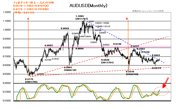 豪ドル/ドル相場を大きく見ると0.4775の史上最安値から上昇が、1.1083で史上最高値をつけて、0.5510で下ヒゲを描いた後は、反発も0.8008で抑えられて再調整気味です。