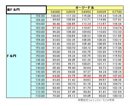 以下は豪ドル/ドル相場とドル円相場の想定レンジから算出したマトリックス・チャート(価格帯によるクロス円の位置)です。