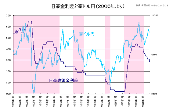 通常円相場は、日本と各国の金利差の影響を大きく受けますが、特に豪ドル円相場は、以下のチャートの通り、過去比較的豪日金利差との連動性が高い状況です。