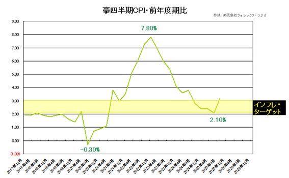一方インフレは、2026年もおおむね2.0%から3.0%のターゲットレンジ付近で推移すると見込まれています。ベースインフレ(基調的な物価上昇)も同レンジ近くで安定的に推移するとしていますが、一部の民間予測では、2026年のヘッドラインインフレ率は約3.0%前後と予想する分析もあります。以下は豪州の四半期CPIの推移ですが、一時の7.80%からは調整のインフレ・ターゲットの下限で下げ止まっており、今後上昇圧力となるか注目されています。