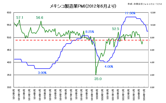 以下はメキシコの製造業PMIの推移です。一旦「50」割れから戻し気味です。今後もメキシコ経済の動向次第です。