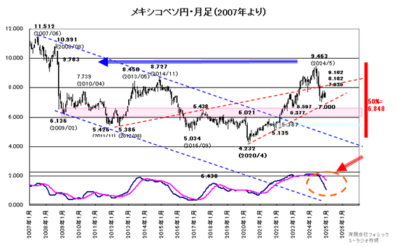一方日本では、参院議員選挙で、自公民が過半数割れとなり、石破首相が辞意を表明、自民党総裁選で高市氏が勝利、公明党が連立から離脱を表明するも、想定外に日本維新の会が新規に連立を組むことになり、高市総理が実現。高市氏の政策が財政拡張や低金利政策を目指していることから日本株高、円売りの「高市トレード」が強まったことで、日経平均株価が年末に向けて5万2千円台まで上昇、円売りの拡大で、メキシコペソ円は、年初来高値となる8.763まで上昇して、年内の取引を終了しました。