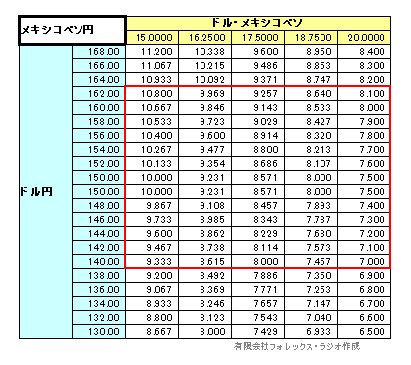 それでは、ドル・メキシコペソ相場とドル円相場の想定レンジから作成したマトリックス・チャート(価格帯によるクロス円の位置)を確認しておきましょう。