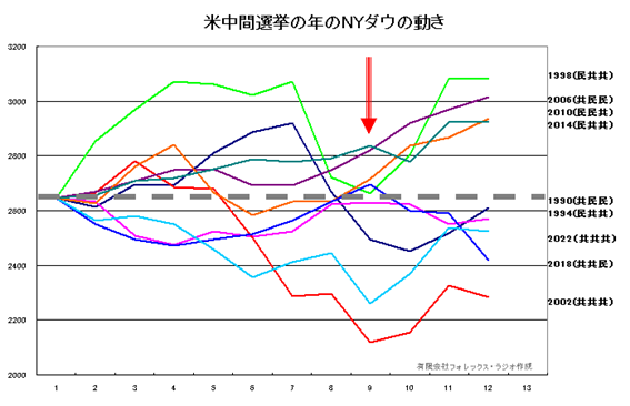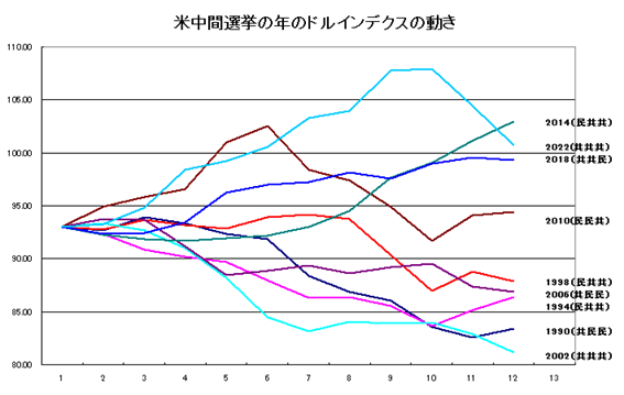 尚以下は米国の中間選挙の年の相場傾向を1990年の価格を基準に調整したNYダウ、ドル・インデックス、ドル円の年初からの動向を比較したチャートです。