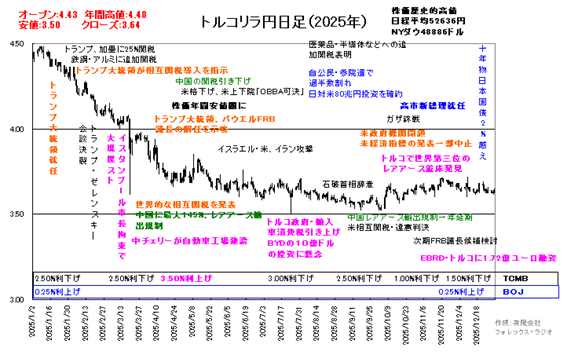 ただ、米国が債務上限法の問題から米政府が史上最長の政府閉鎖となったことから、米雇用統計など重要な経済指標の発表が滞り、市場に警戒感が残りました。一方日本では、参院議員選挙で、自公民が過半数割れとなり、石破首相が辞意を表明、自民党総裁選で高市氏が勝利、公明党が連立から離脱を表明するも、想定外に日本維新の会が新規に連立を組むことになり、高市総理が実現。高市氏の政策が財政拡張や低金利政策を目指していることから日本株高、円売りの「高市トレード」が強まりましたが、トルコリラ円は上昇できず、安値圏での推移を継続しました。