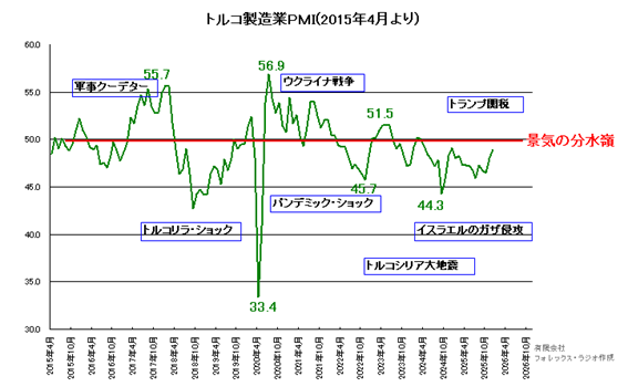 参考にトルコの製造業PMIの状況を見ておきましょう。下限の「44.3」から上昇傾向を示しています。2026年景気の分水嶺となる「50」以上への回復が見えるかは注目されます。