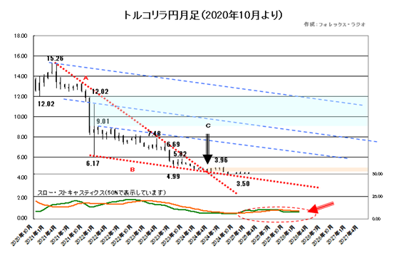 それでは、2020年10月からのトルコリラ円の月足を見てみましょう。