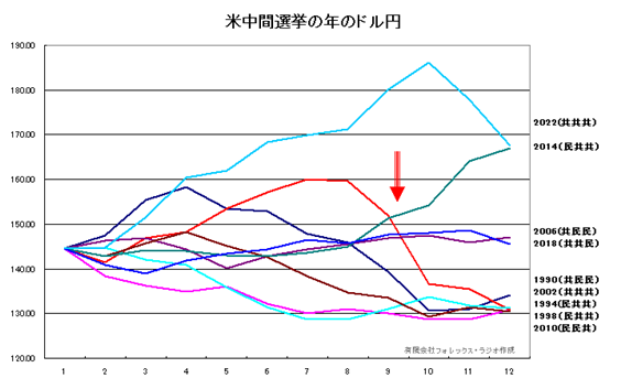 総じてNYダウは、中間選挙前に調整を強める傾向があることは覚えておいてください。また、ドル自体やドル円はあまり上昇傾向が見えていないことも注目しましょう。