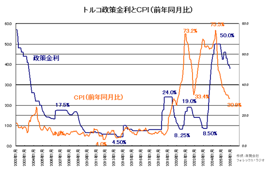 直近のトルコの消費者物価指数の前年同月比では、最も高かった75.5%から30.9%まで低下しています。今後もトルコのインフレを示すかが焦点ですが、少なくとも過去の10%程度への低下はなかなか難しいことは、考慮しておきましょう。