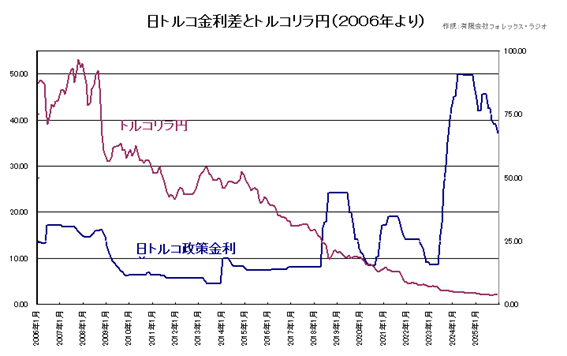 通常円相場は、日本と各国の金利差の影響を大きく受けます。また、比較的高金利通貨には、投資資金が集まり易いですが、日トルコ金利差が、一時50%まで拡大しても、トルコリラ相場を全く支えていないことは注意しておいた方が良いでしょう。