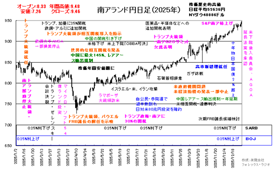 年初は8.33からスタート。ただ、トランプ大統領が、南アの白人迫害や土地没収を根拠に、南ア援助の停止を発表、日銀が半年ぶりに政策金利を0.25%引き上げ0.50%した一方、南ア準備銀行が0.25%の利下げ、トランプ大統領が、カナダとメキシコに対する関税を25%に引き上げ、その後も世界的に関税を引き上げることを次々と発表、特に対抗措置として中国が、レアアースの輸出規制を発表したことなどから、世界的な株価の大幅下落を伴って、大きなリスクオフの動きが一時広がりました。南アランド円相場は7.26の安値まで下落しました。