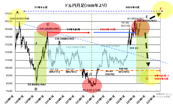 もし、この「E」がピークとなるなら、「G」への下落は、3年4か月経過の2028年4月まで続く形が想定されます。一方「E」がピークとならない場合は、逆に「F」への方向への上昇が、「A」からの経過を考えると2032年4月まで続く可能性が指摘されます。その場合の次のターゲットは、1978年の安値177.06、更には1981年の安値199.06となります。