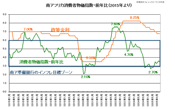 南ア準備銀行は、2021年11月に過去最低水準となる3.5%の政策金利から、世界的なインフレ上昇を背景に、2023年には8.25%まで引き上げた政策金利を、2025年1月、5月、7月、11月と各0.25%ずつ引き下げ、現状は6.75%まで低下させています。