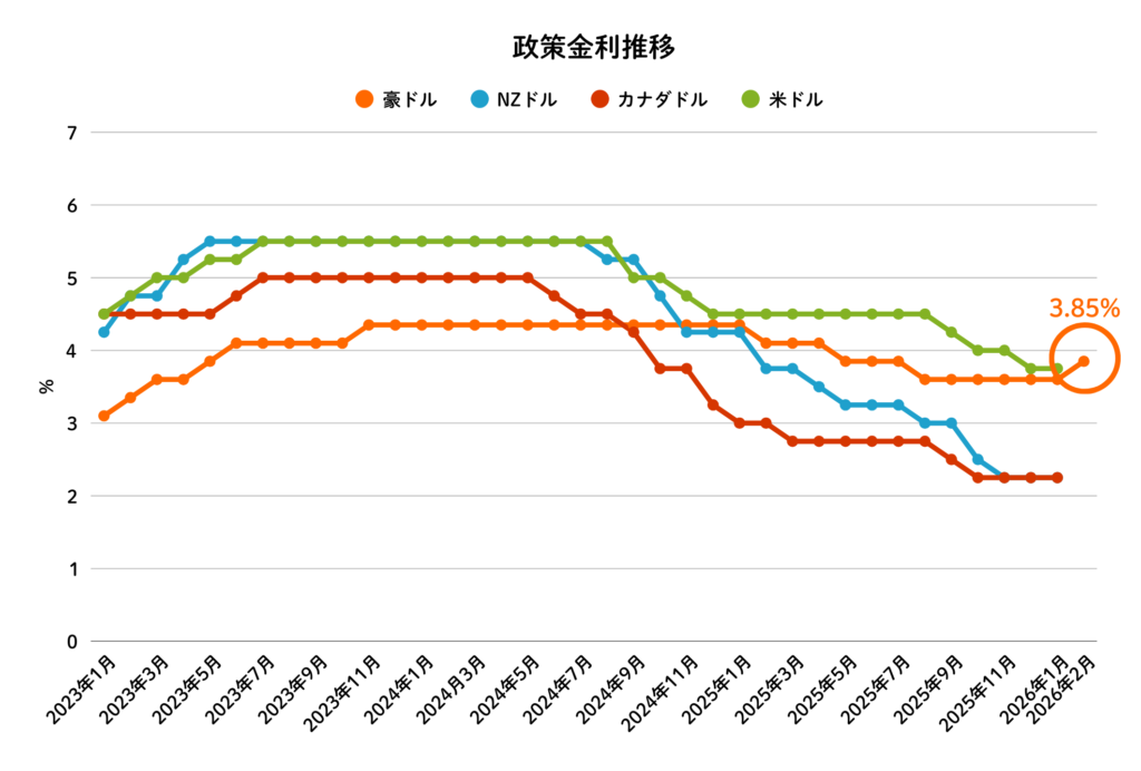 ※2023年1月~2026年2月までの政策金利の推移を表しています。2026年2月はNZドル・カナダドル・米ドルの政策金利発表がないため、豪ドルのみ記載しております。