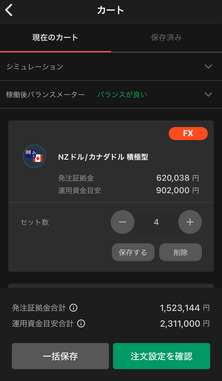 「現在のカート」の欄では、自動売買ごとにセット数の変更を行えます。また、「保存する」を押すと「保存済み」の欄に保存ができます。「削除する」を押すとカートから削除できます。