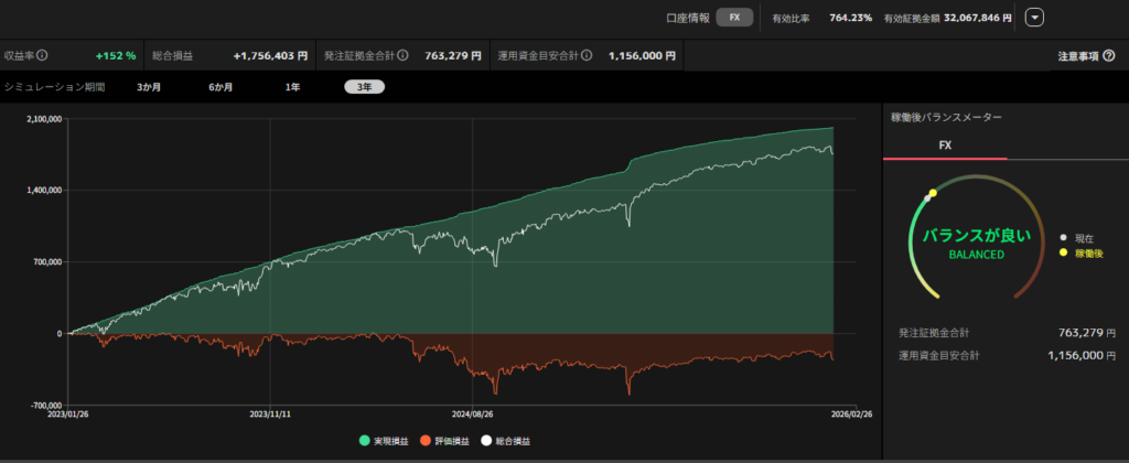 カート画面右上部には、現在カートに追加しているすべての自動売買を稼働した場合のシミュレーションのグラフ・収益率・総合損益、運用資金目安、発注証拠金、稼働後のバランスメーターを表示しております。