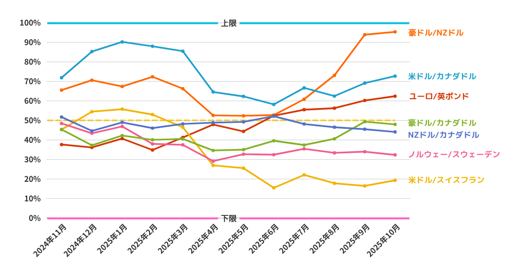 特に豪ドル/NZドルは10月以降も上昇基調を維持しており、直近ではレンジ上限に近い水準で推移しています。