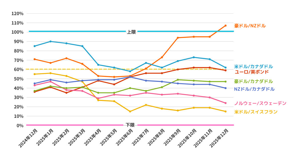 ※本グラフにおける「100%」は各通貨ペアの想定レンジ上限、「0%」はレンジ下限を示しています。